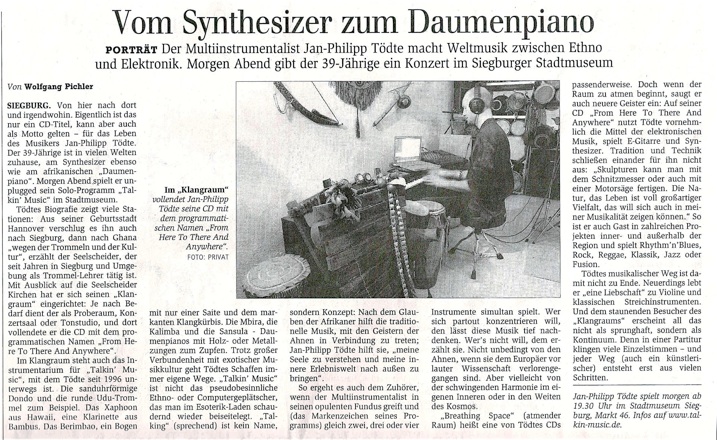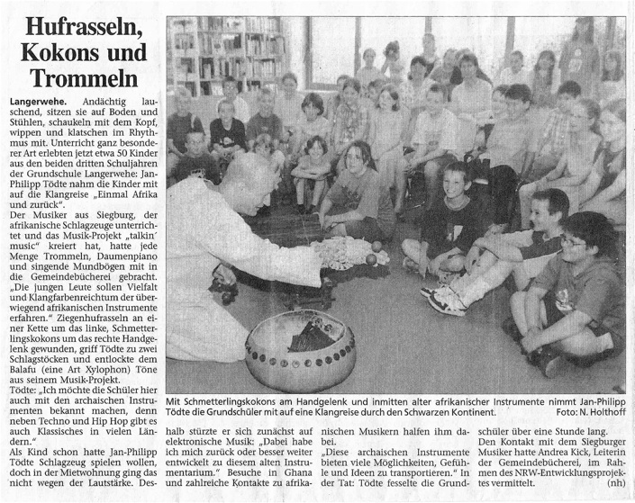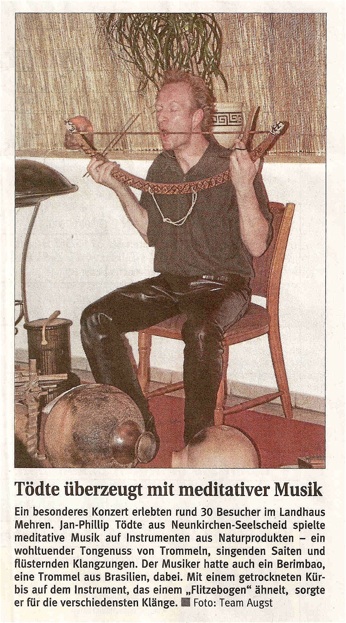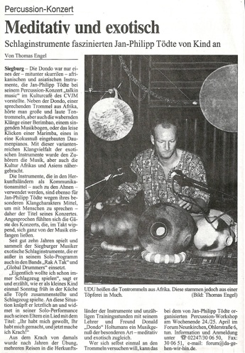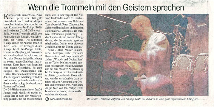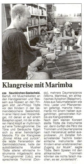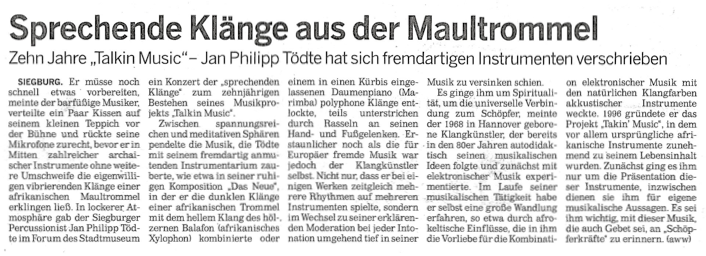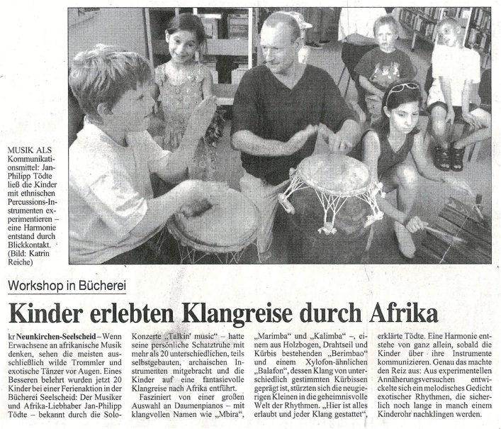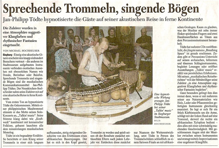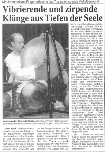 „...klang wie „Kraftwerk“ kombiniert mit kenianischer Folklore, gebannt lauschten alle... Tödte ist ein begnadeter Erzähler... furioses Finale... kaum zu glauben, was der Musiker aus dem Percussionsinstrument herausholt.“